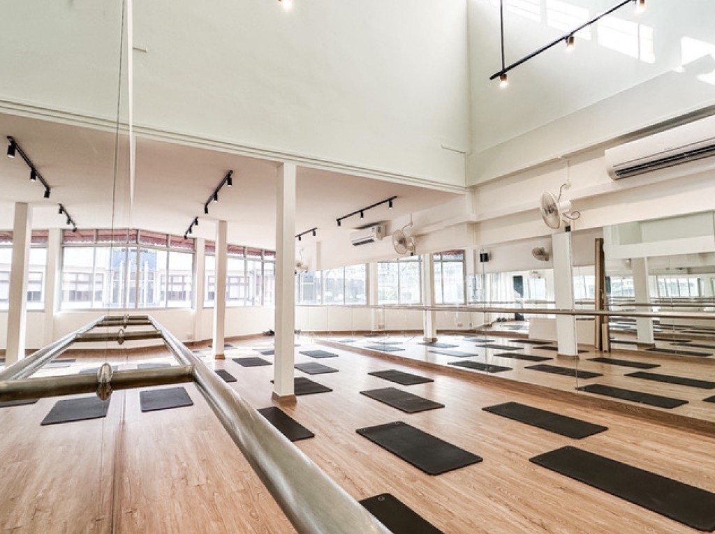 The studio had the charm of a dance space, with wooden floors, mirrored walls and plenty of natural light. Skylights and a partially raised ceiling gave the room an open, airy feel, while neatly stacked blocks, sliders and resistance bands showed clear attention to order and setup. The space felt calm, tidy and well organised, setting a professional tone for the session.